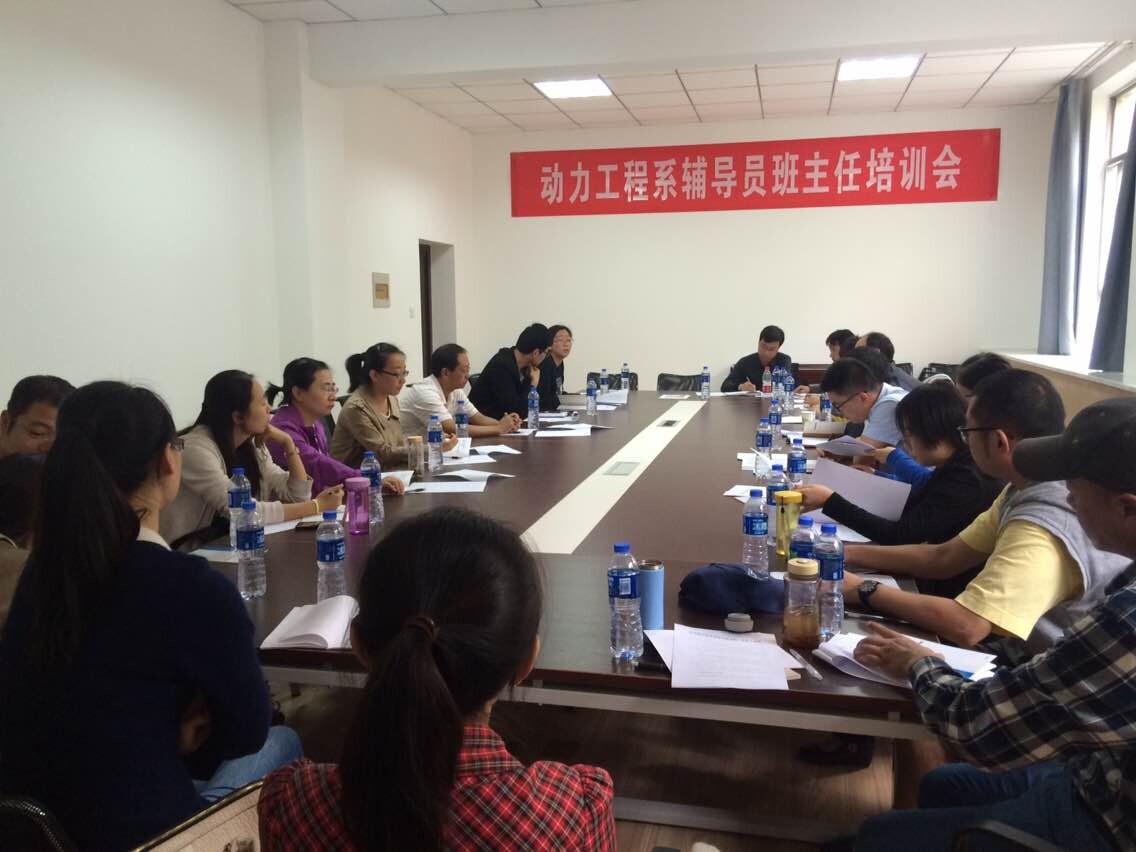10月10日,动力工程系在沣惠校区召开辅导员班主任培训会。学工部部长孙巨峰、系主任金文出席,系党总支书记李永刚主持大会。参加大会的系学生管理科科长魏新宇、全体辅导员、班主任及优秀班主任代表共27人。