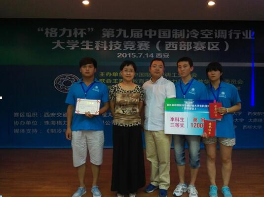 7月13-14日,“格力杯”第九届中国制冷空调行业大学生科技竞赛(西部赛区)在西安工程大学成功举办。由我校建筑与环境学院暖通专业的尚立娇,靳望远及制冷专业的陈浩组成的凌风代表队在魏朝晖与杜芳莉的悉心指导下与各个参赛队进行精彩激烈的角逐。经过团队实践技能操作、创新设计作品答辩、现场专业知识竞答等三个环节后,我校代表队最终取得了本次中国制冷空调行业大学生科技竞赛三等奖的优异成绩。
