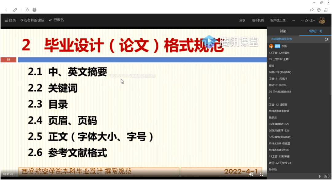 2022年4月1日上午10:00,能源与建筑学院在腾讯会议举行2022届毕业设计(论文)写作规范指导会。会议由学院督导组组长李洁副教授主持,阎良校区能源与建筑学院全体毕业生及部分指导教师参加。