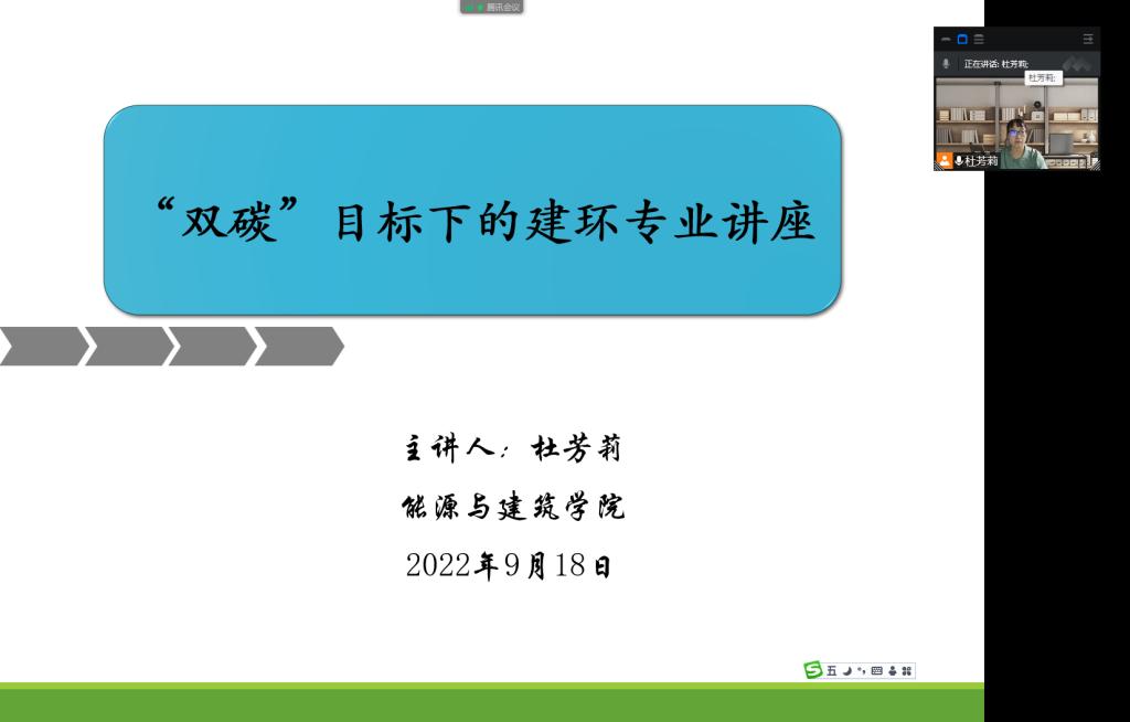 9月18号下午15:00时,建环专业负责人杜芳莉通过腾讯会议平台为同学们进行了“双碳”目标下的建环专业讲座,本次讲座的内容从专业简介、专业现状、培养目标、课程体系、毕业要求、就业深造、培养成效等七个方面介绍建环专业的现状以及发展方向。
