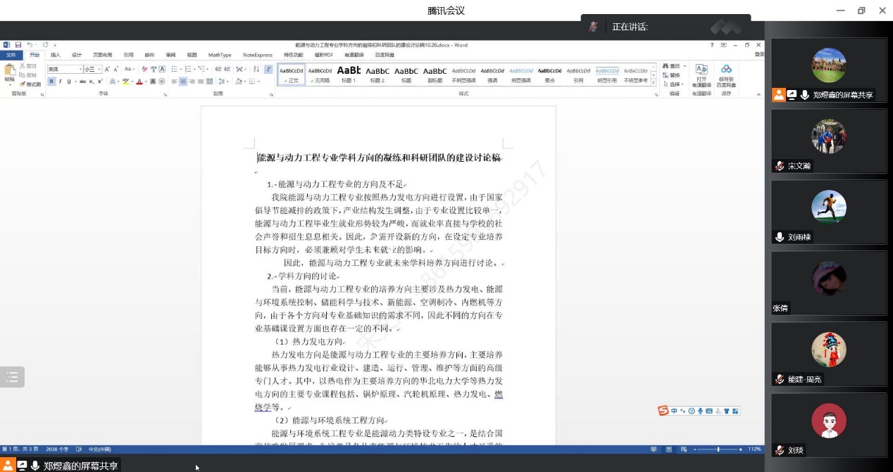 102020:00-9:30点,能源与动力工程教研室以腾讯会议的形式召开了能源与动力工程专业学科方向的凝练和科研团队的建设会议,会议由专业负责人郑煜鑫主持,并邀请了校督导刘雨棣老师参与了会议交流。专业负责人介绍了目前能源与动力工程专业方向和不足之处,并提出六个能动学科方向供能动教研室所有教师进行研讨,包括热力发电、能源与环境系统控制、新能源、储能科学与技术、空调制冷、内燃机。经过大家积极的研讨,凝练出三个学科方向热力发电、能源与环境系统控制和新能源三个方向。另外,明确学科方向后,能动全体教师就能源与动力专业科研团队建设也进行了积极的讨论,未来计划一方面通过引进学科领军人才,另一方面培养现有教师队伍领军人才,拓展与企业和各大高校的交流与合作。