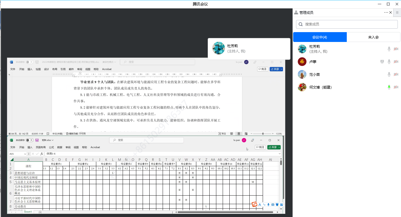 根据学校2023版人才培养方案指导意见,建环专业结合工程认证要求,进一步优化本专业人才培养质量,2023年1月14日上午,建环专业人才培养方案制定小组在腾讯会议线上召开了建环专业“课程体系支撑毕业要求矩阵”专题研讨会。会议由专业负责人杜芳莉主持,教研室主任范小苗、青年骨干教师何文博及卢攀参加。