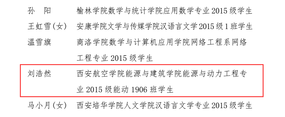 在共青团陕西省委下发的关于表彰2017年度“陕西省优秀共青团员”“陕西省优秀共青团干部”及“陕西省五四红旗团支部”“陕西省五四红旗团委”“陕西省团建先进县”的决定(陕团发[2018] 4号)中,我院能动1906班刘浩然同学荣获“陕西省优秀共青团员”。