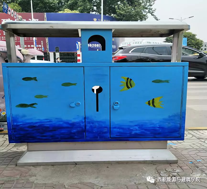 我院志愿者拿着画笔仔细认真的绘画出一幅幅美丽的图案,使阎良的部分街道井盖和垃圾桶变得更加美观。